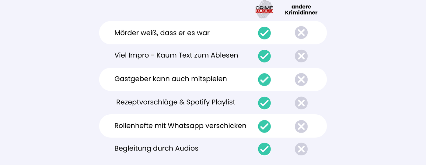 Bei unseren Krimidinnern schlüpfst du selbst in die Hauptrolle. Bei einem gemeinsamen Essen im Kreis der Verdächtigen ist es eure Aufgabe, den Mörder am Tisch zu entlarven. Du verfolgst dabei deine eigenen Ziele und versuchst die Geheimnisse der anderen Mitspieler zu lüften.