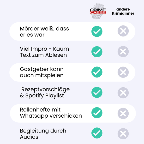 Ich habe das Spiel noch nicht gespielt, war aber von den Krimispielen von Crimecases bisher total überzeugt und gehe damit davon aus, dass auch das Krimidinner nicht entäuschen wird.Es ist möglich das Spiel komplett "offline" zu spielen und die Personenhefte vorher zu verteilen oder online die Personen zuzuteilen und dann direkt über Whatsapp oder Link kopieren die Personenhefte zu verschicken. Den Personen werden dabei unterschiedliche Schwierigkeitsgrade zugeordnet. Je nachdem wer mitspielt, kann man dabei also darauf achten welche Rolle man zuteilt. Weiterer Pluspunkt: Man kann als Gastgeber selbst mitspielen.Außerdem findet man auf der Website die man über QR-Code und persönlichen Zugangscode erreicht eine Spotify Playlist um den Abend musikalisch zu hinterlegen und eine Menge an Rezepten um auch für das leibliche Wohl zu sorgen.Der Aufbau der Website ist ziemlich einfach, sodass sich dort jeder zurechtfinden sollte!Mit Crimecases kann man eigentlich nichts falsch machen :)