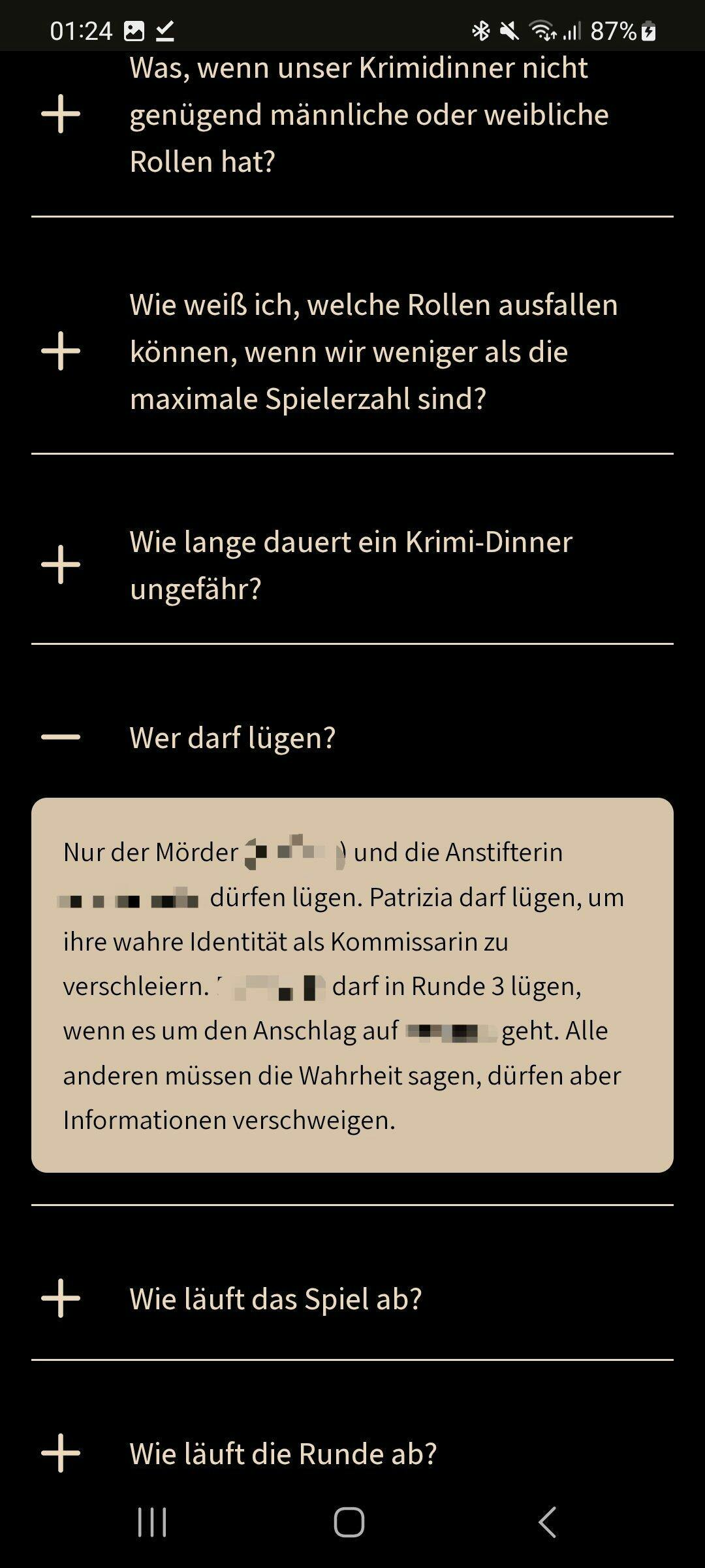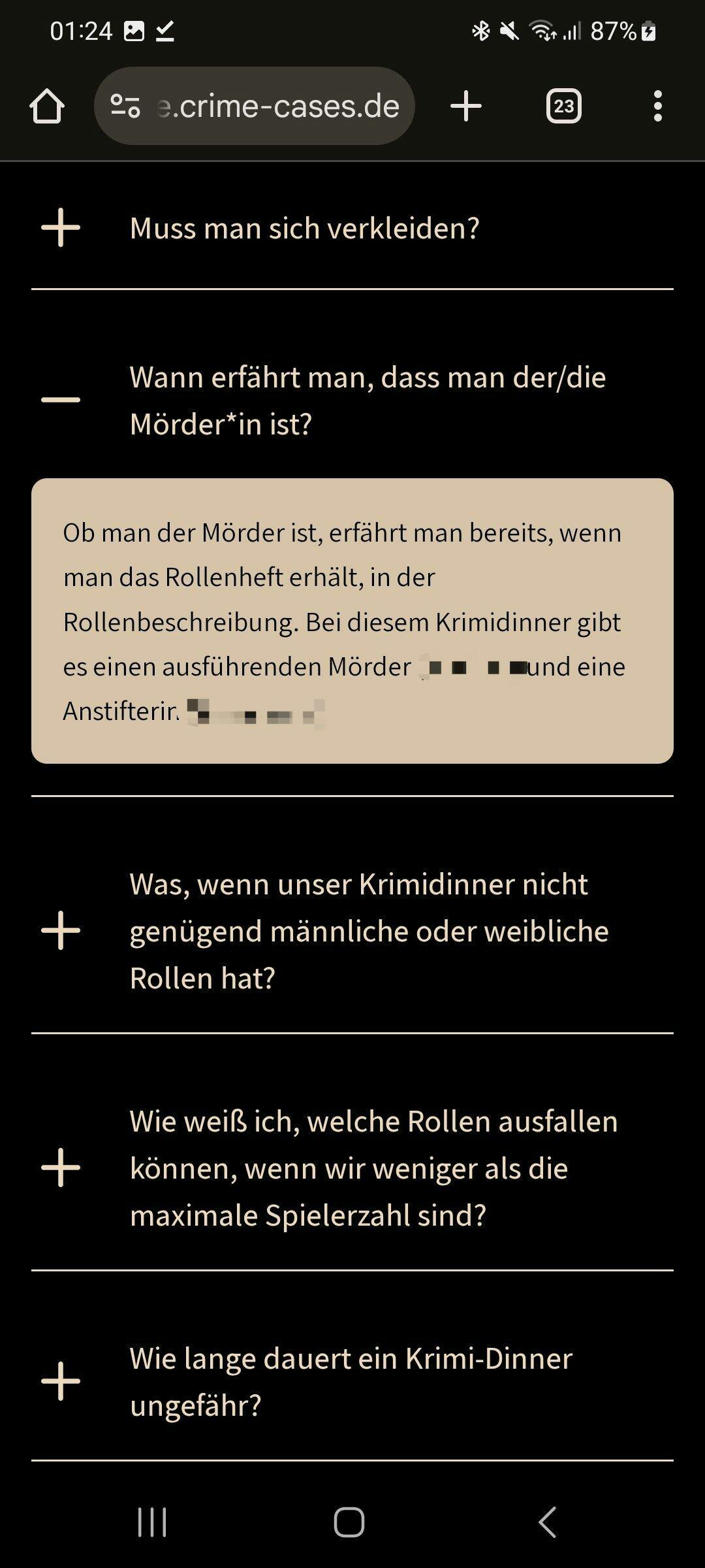 Hallo Liebes Crime Cases Team, ich würde euch gerne auf einen Bugg in der Spielleiter Website aufmerksam machen. Unter FAQ findet man die Fragen, "Wer darf lügen?" und "Wann erfährt man das man der Mörder ist?". Bei beiden dieser Fragen steht die Auflösung des Krimidinners. Ich hab mich also leider versehentlich vor dem krimidinner gespoilert. Ich hab 2 Fotos angefügt, es aber verpixelt, damit niemand anderes hier gespoilert wird. Es wäre echt cool das zu fixen, da es für mich echt blöd war, beim mitspielen. Liebe Grüße (das Krimidinner ist echt toll ♥️)