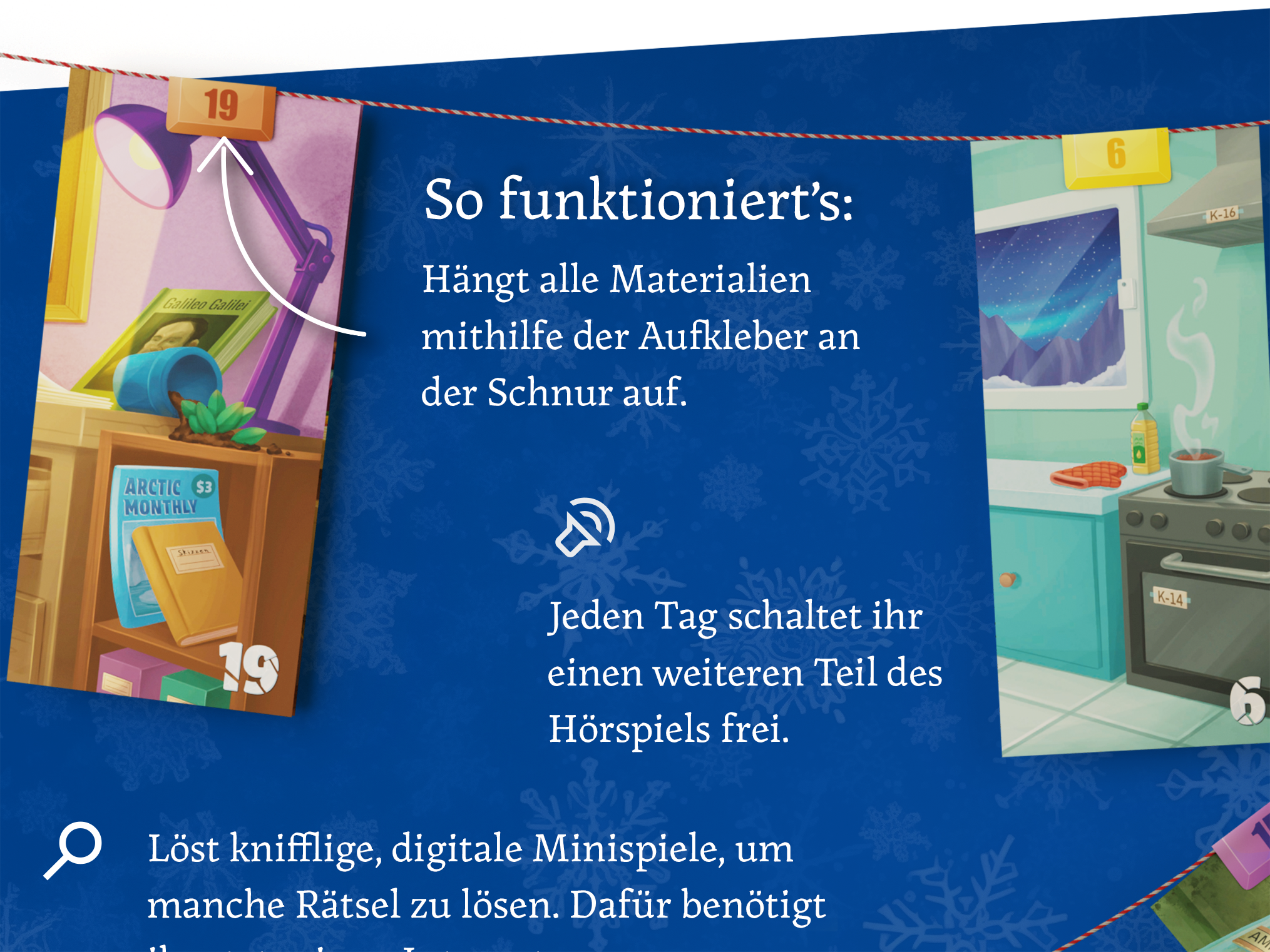 Die Rätselkarten können mithilfe der beiliegenden Aufkleber an einer Schnur aufgehängt werden, sodass ihr jeden Tag eine neue Karte im Blick habt.