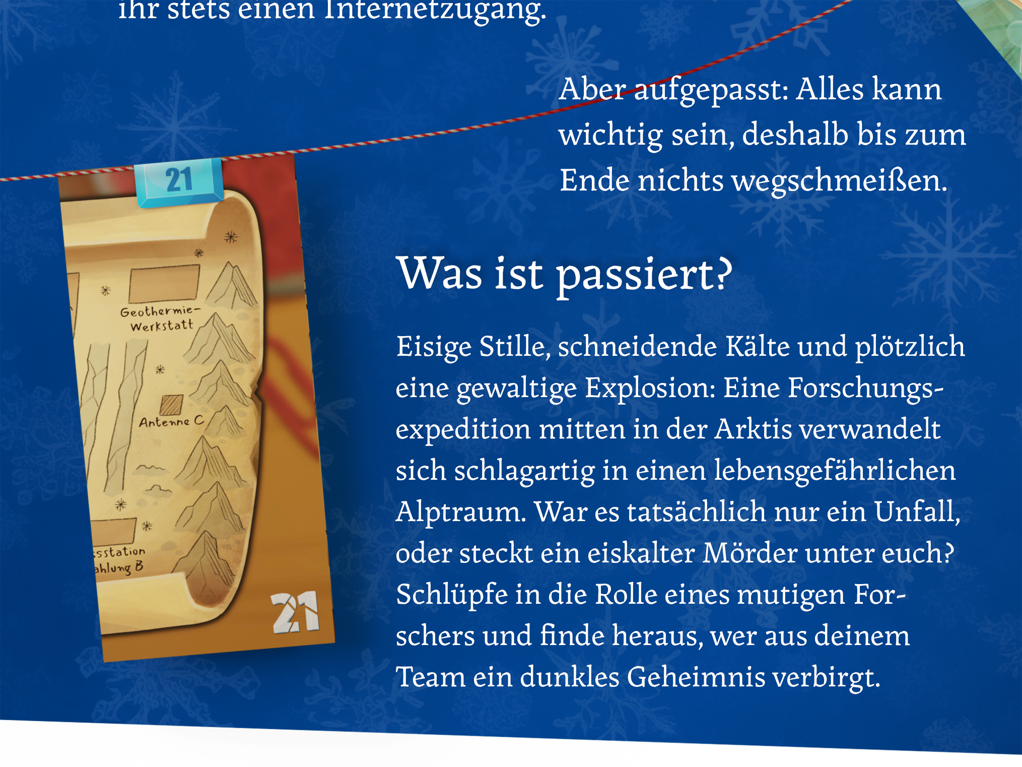 Du bekommst einen Umschlag mit 24 Rätseln und Hinweisen. Jeden Tag entschlüsselst du ein neues Rätsel und kommst damit dem Verbrecher Stück für Stück auf die Schliche. Alles kann ein Hinweis sein, deshalb ist hierbei geschicktes Kombinieren gefragt.